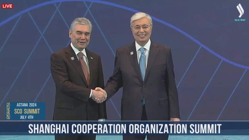 Chairman of the Halk Maslahaty of Turkmenistan Gurbanguly Berdimuhamedov, Mongolian President Ukhnaagiin Khurelsukh and Azerbaijan President Ilham Aliyev walked the blue carpet for the handshake event and were greeted by President Tokayev at the venue.