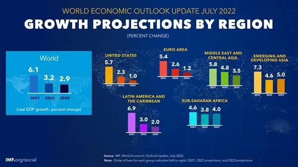 «Risks began to materialize.» That’s what the International Monetary Fund also said in their World Economic Outlook as of July 2022. Experts forecast growth to slow from 6.1 percent last year to 3.2 percent in 2022, 0.4 percentage points lower than in the April outlook, and moderate to 2.9 percent in 2023.«Global output contracted in the second quarter of this year, owing to downturns in China and Russia, while US consumer spending undershot expectations. Several shocks have hit a world economy already weakened by the pandemic: higher-than-expected inflation worldwide––especially in the United States and major European economies––triggering tighter financial conditions; a worse-than-anticipated slowdown in China, reflecting COVID- 19 outbreaks and lockdowns; and further negative spillovers from the situation in Ukraine,» said the IMF in the report.