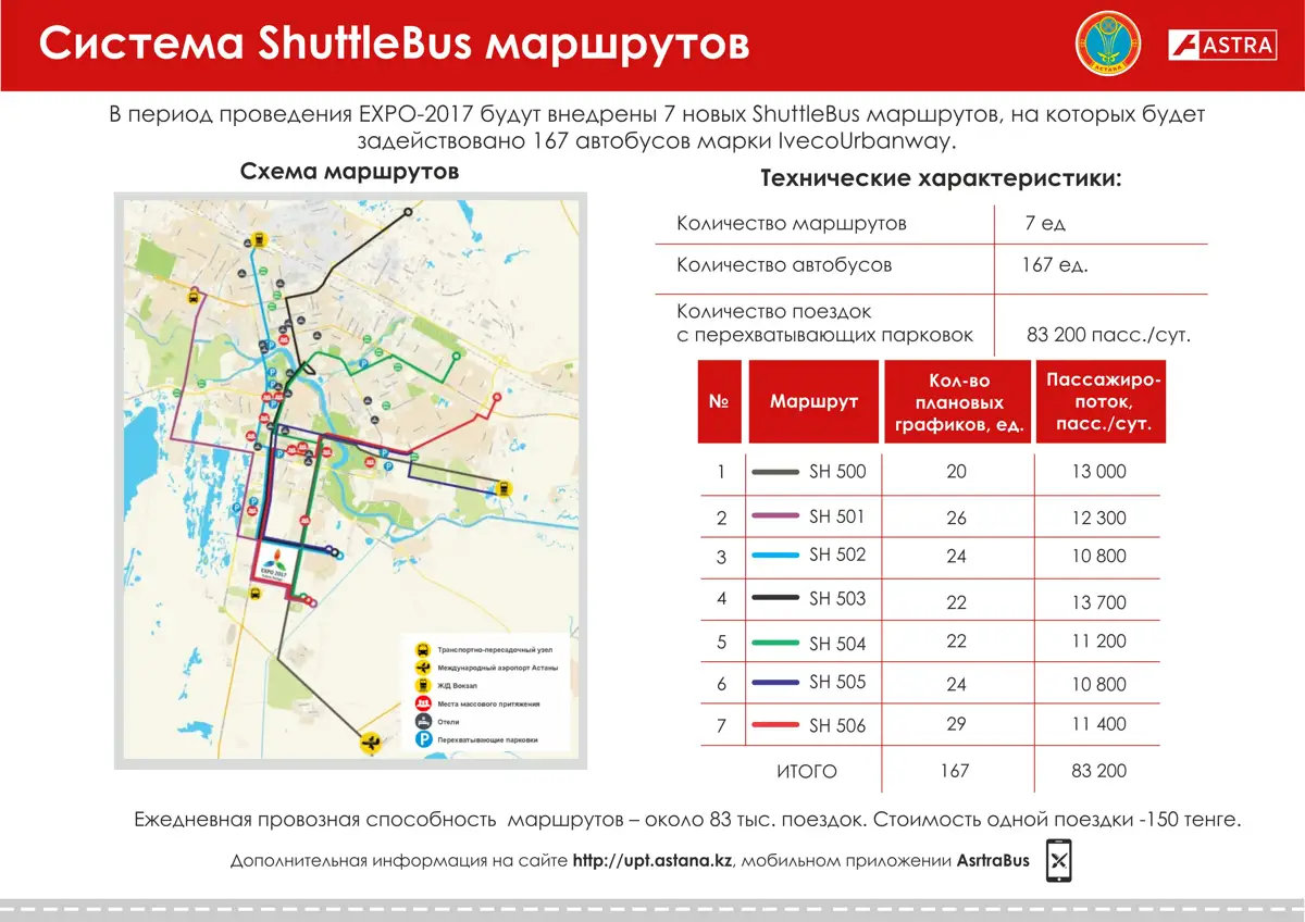 Bekmyrza Igenberdinov, head of the Passenger Transport Office of Astana city, said that each shuttle bus will make eight stops along its route and up to 340,000 people will be able to use bus service to get to the EXPO town daily.